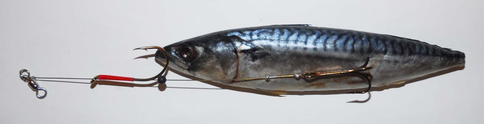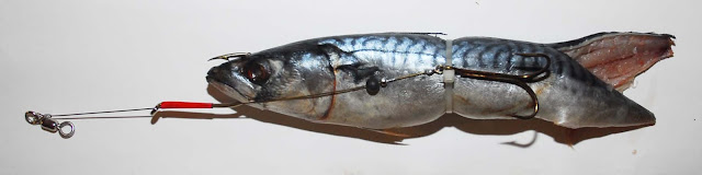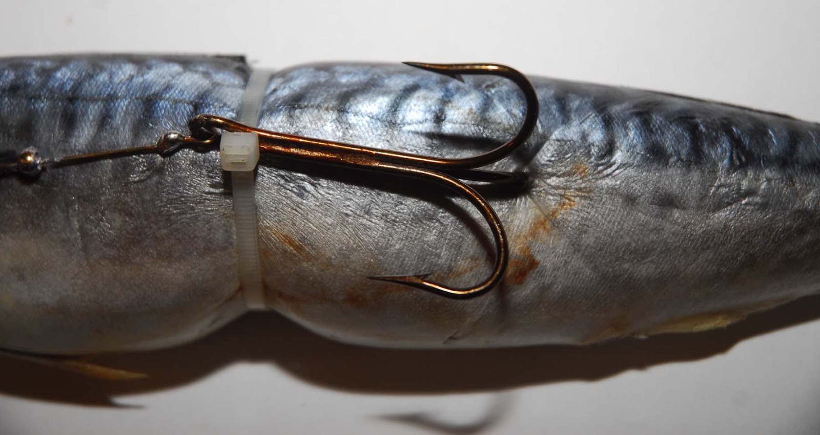 Наживка: в тушку рыбы без хвоста сначала втыкается тройник на расстоянии примерно 1./3 от хвоста.