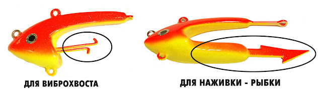 Джиг-головки для ловли "на рыбку" отличаются тем, что в нижней части у них довольно большой штырь, на который насаживается рыба.