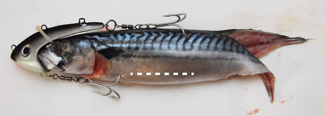Мало того, думаю, что прорезь на брюшке (белый пунктир) даст возможность воде вымывать внутренности - а это еще один привлекающий фактор.